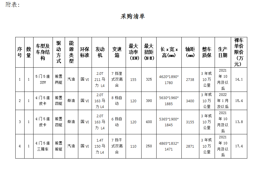 1.根據(jù)業(yè)務發(fā)展需要,滁州市興元商貿有限公司擬集中采購業(yè)務保障車輛共計4輛,詳情見附表。
